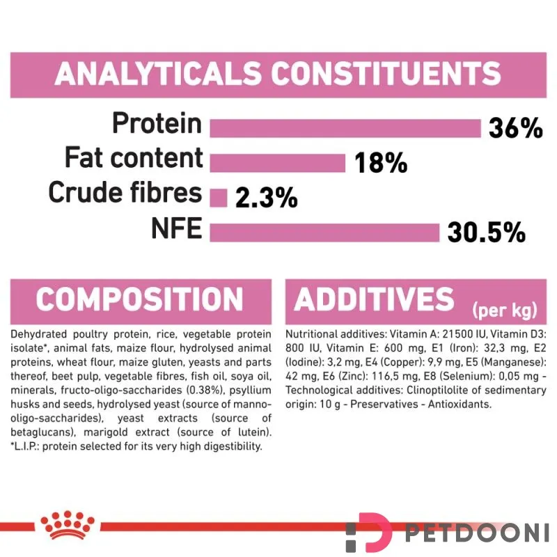 پروتئین خشک طیور، برنج، کنجاله گلوتن گندم*، چربی حیوانی، کنجاله خوراک ذرت، پروتئین حیوانی هیدرولیز شده، کنجاله خوراک گندم، کنجاله گلوتن ذرت، محصولات جانبی مخمر، تفاله چغندر خشک، لیگنوسلولز، مواد معدنی، روغن سویا، روغن ماهی، پسیلیوم [پوسته و دانه]، فروکتو-الیگوساکاریدها، مخمر هیدرولیز شده [منبع مانان-الیگوساکاریدها و بتا گلوکان] (0.29%)، روغن جلبک Schizochytrium sp. [منبع DHA]، کنجاله گل همیشه بهار.