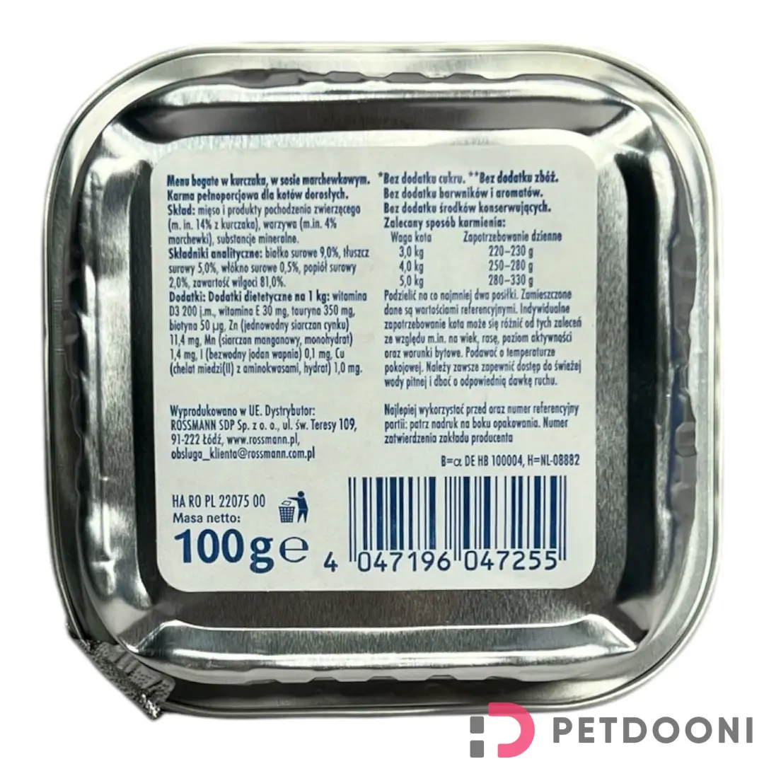 مناسب برای گربه های بالغ همهی نژادها تهیه شده از مرغ در سس هویج خوش طعم و لذیذ حاوی تائورین برای حفظ سلامت سیستم قلبی و عروقی و بینایی دارای انواع ویتامین ها و مواد معدنی ضروری گربه ها بدون غلات و مواد افزودنی و شکر مناسب برای دو وعده غذایی