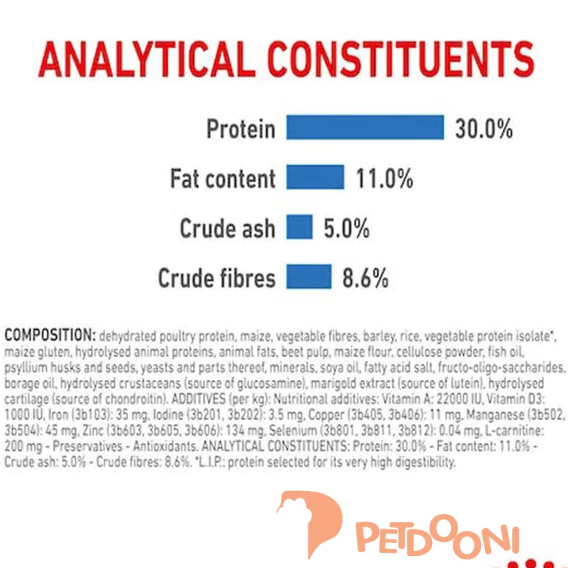 غذای رژیمی ویژه، مناسب سگهای نژاد کوچک جلوگیری از اضافه وزن به دلیل چربی کمتر حاوی 15 ٪ کالری کمتر، کمک به کاهش و یا حفظ وزن سگ بهبود متابولیسم چربی و ایجاد وزن ایدهآل حاوی ۳۰ % پروتئین مرغوب با سطح پایین چربی محتوای پروتئین بالا برای حفاظت از توده عضلانی حاوی فیبر های محلول و نامحلول حاوی ال-کارنیتین تقویت سیستم ایمنی بدن به کمک انتی اکسیدان هایی نظیر ویتامین E شامل پلی فنول جهت جلوگیری از پیری سلول و بروز مشکلات قلبی و گردش خون تقویت مفاصل و تقویت کننده پوست و مو با اسیدهای چرب امگا 3 و 6 زیر نظر فدراسیون صنایع غذایی حیوانات خانگی اروپا (FEDIAF) فرموله شده زیر نظر متخصصین علم دامپزشکی طعمی لذیذ و خوشمزه کمک به سلامت دهان و دندان دارای سطح مناسب بالانس انرژی تهیه شده از مرغوب ترین مواد اولیه