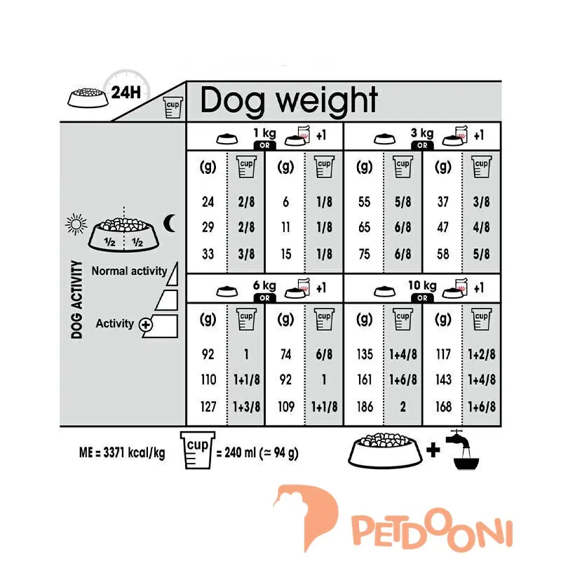برای دستیابی به نتایج مؤثر در کنترل وزن و حفظ سلامت سگهای نژاد کوچک، مصرف روزانه غذای خشک باید متناسب با وزن سگ و سطح فعالیت بدنی او تنظیم شود. در ادامه راهنمای پیشنهادی Royal Canin برای میزان مصرف غذای خشک رژیمی مینی لایت ویت ارائه شده است.