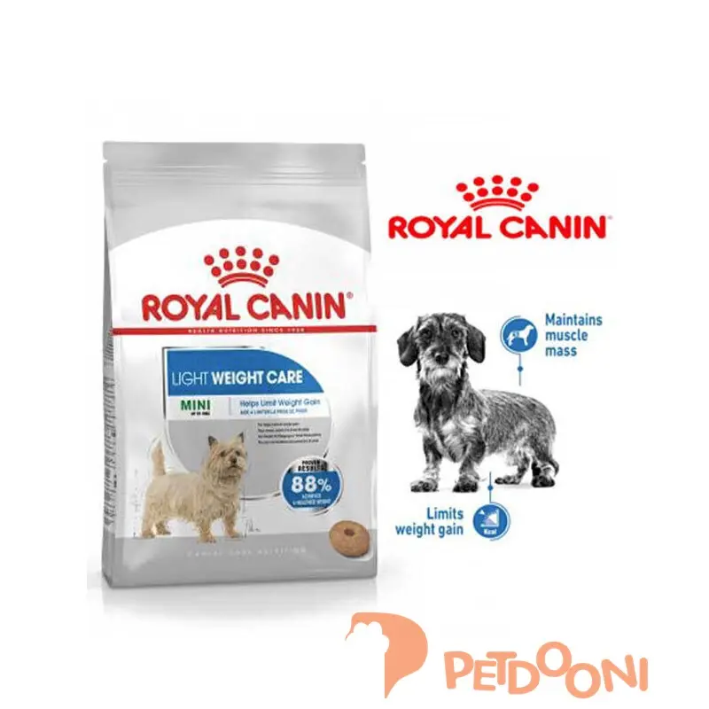 غذای خشک Royal Canin Mini Light Weight Care, برای سگهای بالغ نژاد کوچک مستعد افزایش وزن طراحی شده است.این غذا غنی از پروتئین (30٪) مناسب برای حفظ، ترویج و توسعه عضلانی و ماهیچهای است. محتوای کم چرب (11٪) و کاهش کالری 15٪ در مقایسه یک رژیم غذایی معمولی، به نگه داشتن وزن سالم سگ کمک میکند. در حالی که ال-کارنیتین اضافه شده ذخایر چربی بدن را بکار انداخته و عمل چربی سوزی را تحریک میکند. برخی نژادهای سگهای کوچک، مانند مینیاتوری مو بلند و مینیاتوری Shelties و Cavalier King Charles Spaniels و Cairn Terriers و Miniature Schnauzers، زمینه ژنتیکی چاقی و یا تمایل طبیعی به پرخوری دارند. این محصول با ایده تامین نیازهای خاص سگهای نژاد کوچک که عمدتا اضافه وزن دارند فراهم شده است.
