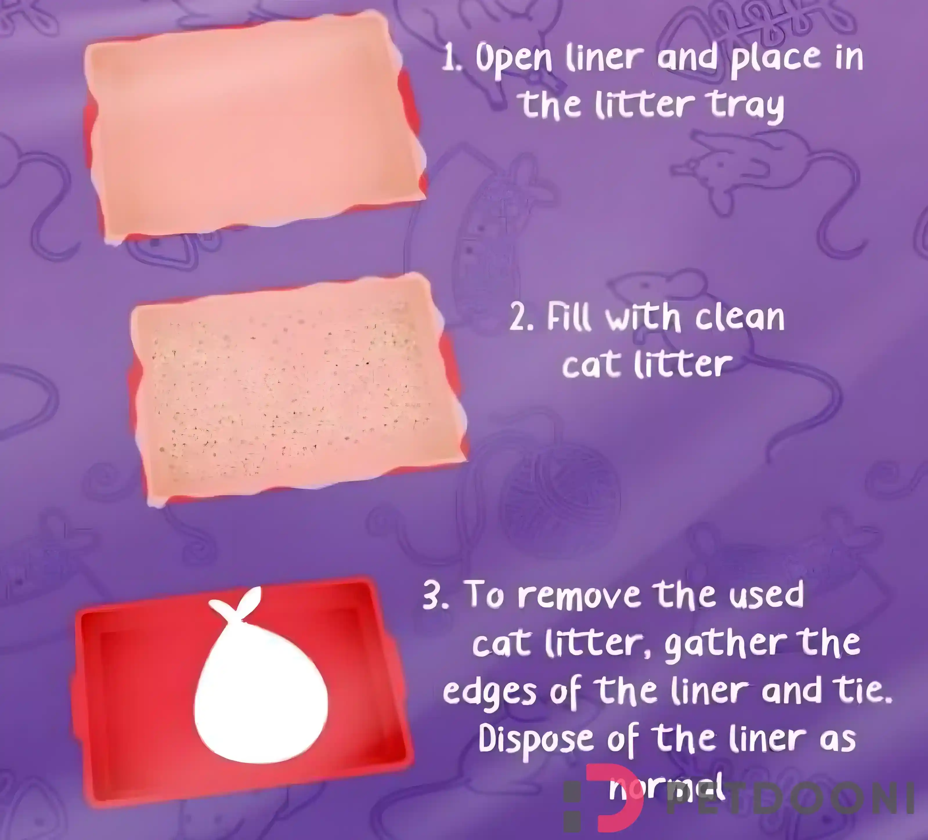 1. لاینر را باز کنید و داخل ظرف خاک قرار دهید. 2. روی آن خاک تمیز بریزید. 3. جهت دور انداخن خاک گربه استفاده شده، گوشه های لاینر را گره بزنید و کیسه را دور بیندازید.